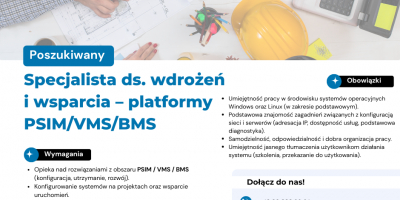 27.02.2026 Instalator/Serisant 12.02.2026 Specjalista/ka ds. wdrożeń i wsparcia - platformy PSIM/VMS/BMS 09.02.2026 Główny Specjalista/tka ds. Projektowania